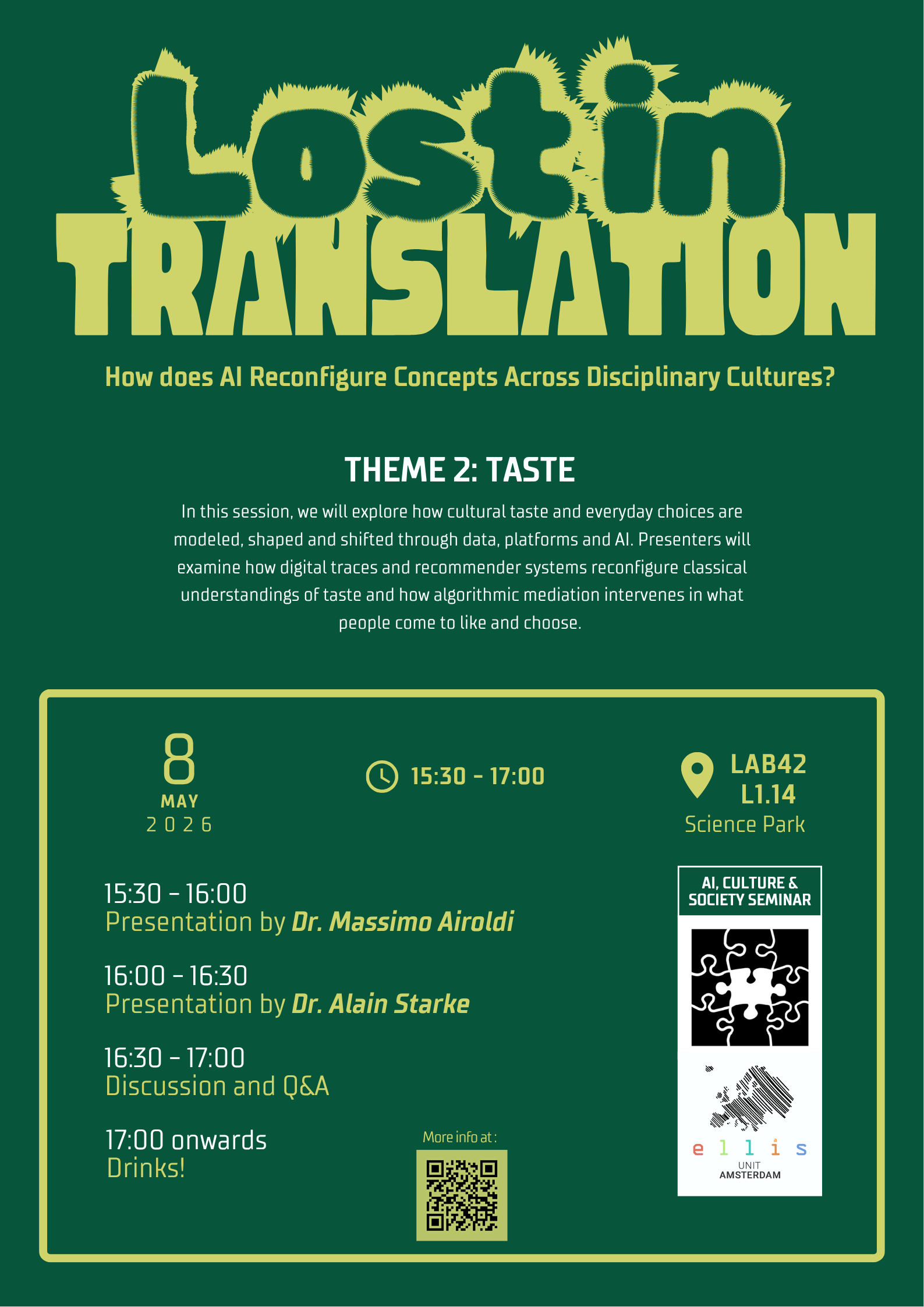 In this session, we will explore how cultural taste and everyday choices are modeled, shaped and shifted through data, platforms and AI. Presenters will examine how digital traces and recommender systems reconfigure classical understandings of taste and how algorithmic mediation intervenes in what people come to like and choose. Drawing on work in cultural sociology, consumer research and recommender-system design, the session brings together perspectives on algorithmically mediated taste and recommendations, from music to food, highlighting how algorithms not only reflect but also transform preferences. The session invites reflection on how abstract notions of “taste” are operationalized, nudged and negotiated in AI-driven environments.